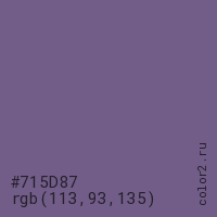 Цвет #715D87 в цветовой модели RGB обозначается тремя октетами (113, 93, 135) в десятичном формате и #715D87 в шестнадцатиричном (hex) формате, которые являются интенсивностью красного 113 (hex 71), интенсивность зелёного 93 (hex 5D) и интенсивность синего 135 (hex 87).