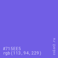 Цвет #715EE5 в цветовой модели RGB обозначается тремя октетами (113, 94, 229) в десятичном формате и #715EE5 в шестнадцатиричном (hex) формате, которые являются интенсивностью красного 113 (hex 71), интенсивность зелёного 94 (hex 5E) и интенсивность синего 229 (hex E5).