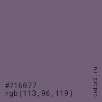 Цвет #716077 в цветовой модели RGB обозначается тремя октетами (113, 96, 119) в десятичном формате и #716077 в шестнадцатиричном (hex) формате, которые являются интенсивностью красного 113 (hex 71), интенсивность зелёного 96 (hex 60) и интенсивность синего 119 (hex 77).
