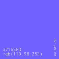 Цвет #7162FD в цветовой модели RGB обозначается тремя октетами (113, 98, 253) в десятичном формате и #7162FD в шестнадцатиричном (hex) формате, которые являются интенсивностью красного 113 (hex 71), интенсивность зелёного 98 (hex 62) и интенсивность синего 253 (hex FD).