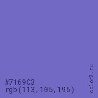 Цвет #7169C3 в цветовой модели RGB обозначается тремя октетами (113, 105, 195) в десятичном формате и #7169C3 в шестнадцатиричном (hex) формате, которые являются интенсивностью красного 113 (hex 71), интенсивность зелёного 105 (hex 69) и интенсивность синего 195 (hex C3).
