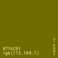 Цвет #716C01 в цветовой модели RGB обозначается тремя октетами (113, 108, 1) в десятичном формате и #716C01 в шестнадцатиричном (hex) формате, которые являются интенсивностью красного 113 (hex 71), интенсивность зелёного 108 (hex 6C) и интенсивность синего 1 (hex 01).