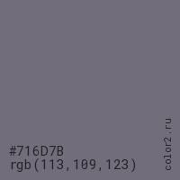 Цвет #716D7B в цветовой модели RGB обозначается тремя октетами (113, 109, 123) в десятичном формате и #716D7B в шестнадцатиричном (hex) формате, которые являются интенсивностью красного 113 (hex 71), интенсивность зелёного 109 (hex 6D) и интенсивность синего 123 (hex 7B).
