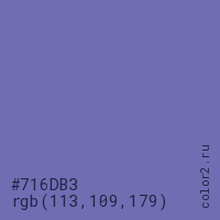 Цвет #716DB3 в цветовой модели RGB обозначается тремя октетами (113, 109, 179) в десятичном формате и #716DB3 в шестнадцатиричном (hex) формате, которые являются интенсивностью красного 113 (hex 71), интенсивность зелёного 109 (hex 6D) и интенсивность синего 179 (hex B3).