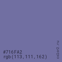Цвет #716FA2 в цветовой модели RGB обозначается тремя октетами (113, 111, 162) в десятичном формате и #716FA2 в шестнадцатиричном (hex) формате, которые являются интенсивностью красного 113 (hex 71), интенсивность зелёного 111 (hex 6F) и интенсивность синего 162 (hex A2).