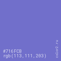 Цвет #716FCB в цветовой модели RGB обозначается тремя октетами (113, 111, 203) в десятичном формате и #716FCB в шестнадцатиричном (hex) формате, которые являются интенсивностью красного 113 (hex 71), интенсивность зелёного 111 (hex 6F) и интенсивность синего 203 (hex CB).