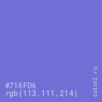 Цвет #716FD6 в цветовой модели RGB обозначается тремя октетами (113, 111, 214) в десятичном формате и #716FD6 в шестнадцатиричном (hex) формате, которые являются интенсивностью красного 113 (hex 71), интенсивность зелёного 111 (hex 6F) и интенсивность синего 214 (hex D6).