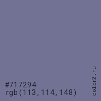 Цвет #717294 в цветовой модели RGB обозначается тремя октетами (113, 114, 148) в десятичном формате и #717294 в шестнадцатиричном (hex) формате, которые являются интенсивностью красного 113 (hex 71), интенсивность зелёного 114 (hex 72) и интенсивность синего 148 (hex 94).
