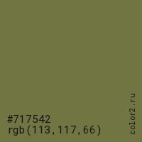 Цвет #717542 в цветовой модели RGB обозначается тремя октетами (113, 117, 66) в десятичном формате и #717542 в шестнадцатиричном (hex) формате, которые являются интенсивностью красного 113 (hex 71), интенсивность зелёного 117 (hex 75) и интенсивность синего 66 (hex 42).