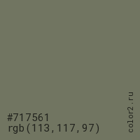 Цвет #717561 в цветовой модели RGB обозначается тремя октетами (113, 117, 97) в десятичном формате и #717561 в шестнадцатиричном (hex) формате, которые являются интенсивностью красного 113 (hex 71), интенсивность зелёного 117 (hex 75) и интенсивность синего 97 (hex 61).