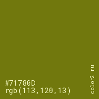 Цвет #71780D в цветовой модели RGB обозначается тремя октетами (113, 120, 13) в десятичном формате и #71780D в шестнадцатиричном (hex) формате, которые являются интенсивностью красного 113 (hex 71), интенсивность зелёного 120 (hex 78) и интенсивность синего 13 (hex 0D).