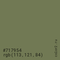 Цвет #717954 в цветовой модели RGB обозначается тремя октетами (113, 121, 84) в десятичном формате и #717954 в шестнадцатиричном (hex) формате, которые являются интенсивностью красного 113 (hex 71), интенсивность зелёного 121 (hex 79) и интенсивность синего 84 (hex 54).
