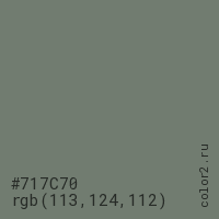 Цвет #717C70 в цветовой модели RGB обозначается тремя октетами (113, 124, 112) в десятичном формате и #717C70 в шестнадцатиричном (hex) формате, которые являются интенсивностью красного 113 (hex 71), интенсивность зелёного 124 (hex 7C) и интенсивность синего 112 (hex 70).