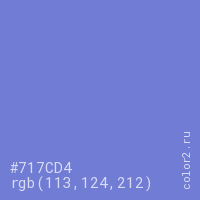 Цвет #717CD4 в цветовой модели RGB обозначается тремя октетами (113, 124, 212) в десятичном формате и #717CD4 в шестнадцатиричном (hex) формате, которые являются интенсивностью красного 113 (hex 71), интенсивность зелёного 124 (hex 7C) и интенсивность синего 212 (hex D4).