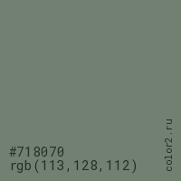 Цвет #718070 в цветовой модели RGB обозначается тремя октетами (113, 128, 112) в десятичном формате и #718070 в шестнадцатиричном (hex) формате, которые являются интенсивностью красного 113 (hex 71), интенсивность зелёного 128 (hex 80) и интенсивность синего 112 (hex 70).