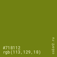 Цвет #718112 в цветовой модели RGB обозначается тремя октетами (113, 129, 18) в десятичном формате и #718112 в шестнадцатиричном (hex) формате, которые являются интенсивностью красного 113 (hex 71), интенсивность зелёного 129 (hex 81) и интенсивность синего 18 (hex 12).