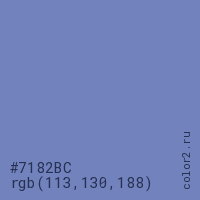 Цвет #7182BC в цветовой модели RGB обозначается тремя октетами (113, 130, 188) в десятичном формате и #7182BC в шестнадцатиричном (hex) формате, которые являются интенсивностью красного 113 (hex 71), интенсивность зелёного 130 (hex 82) и интенсивность синего 188 (hex BC).
