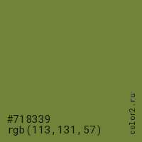 Цвет #718339 в цветовой модели RGB обозначается тремя октетами (113, 131, 57) в десятичном формате и #718339 в шестнадцатиричном (hex) формате, которые являются интенсивностью красного 113 (hex 71), интенсивность зелёного 131 (hex 83) и интенсивность синего 57 (hex 39).