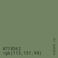 Цвет #718362 в цветовой модели RGB обозначается тремя октетами (113, 131, 98) в десятичном формате и #718362 в шестнадцатиричном (hex) формате, которые являются интенсивностью красного 113 (hex 71), интенсивность зелёного 131 (hex 83) и интенсивность синего 98 (hex 62).