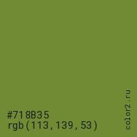 Цвет #718B35 в цветовой модели RGB обозначается тремя октетами (113, 139, 53) в десятичном формате и #718B35 в шестнадцатиричном (hex) формате, которые являются интенсивностью красного 113 (hex 71), интенсивность зелёного 139 (hex 8B) и интенсивность синего 53 (hex 35).
