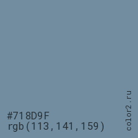 Цвет #718D9F в цветовой модели RGB обозначается тремя октетами (113, 141, 159) в десятичном формате и #718D9F в шестнадцатиричном (hex) формате, которые являются интенсивностью красного 113 (hex 71), интенсивность зелёного 141 (hex 8D) и интенсивность синего 159 (hex 9F).