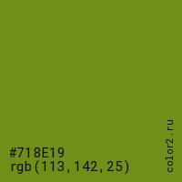 Цвет #718E19 в цветовой модели RGB обозначается тремя октетами (113, 142, 25) в десятичном формате и #718E19 в шестнадцатиричном (hex) формате, которые являются интенсивностью красного 113 (hex 71), интенсивность зелёного 142 (hex 8E) и интенсивность синего 25 (hex 19).
