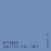Цвет #718EBA в цветовой модели RGB обозначается тремя октетами (113, 142, 186) в десятичном формате и #718EBA в шестнадцатиричном (hex) формате, которые являются интенсивностью красного 113 (hex 71), интенсивность зелёного 142 (hex 8E) и интенсивность синего 186 (hex BA).