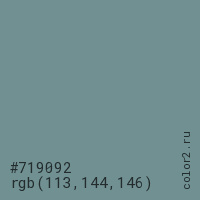 Цвет #719092 в цветовой модели RGB обозначается тремя октетами (113, 144, 146) в десятичном формате и #719092 в шестнадцатиричном (hex) формате, которые являются интенсивностью красного 113 (hex 71), интенсивность зелёного 144 (hex 90) и интенсивность синего 146 (hex 92).