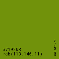 Цвет #71920B в цветовой модели RGB обозначается тремя октетами (113, 146, 11) в десятичном формате и #71920B в шестнадцатиричном (hex) формате, которые являются интенсивностью красного 113 (hex 71), интенсивность зелёного 146 (hex 92) и интенсивность синего 11 (hex 0B).