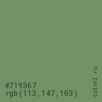 Цвет #719367 в цветовой модели RGB обозначается тремя октетами (113, 147, 103) в десятичном формате и #719367 в шестнадцатиричном (hex) формате, которые являются интенсивностью красного 113 (hex 71), интенсивность зелёного 147 (hex 93) и интенсивность синего 103 (hex 67).