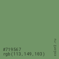 Цвет #719567 в цветовой модели RGB обозначается тремя октетами (113, 149, 103) в десятичном формате и #719567 в шестнадцатиричном (hex) формате, которые являются интенсивностью красного 113 (hex 71), интенсивность зелёного 149 (hex 95) и интенсивность синего 103 (hex 67).