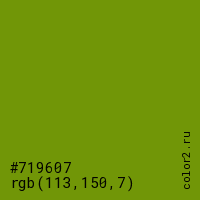 Цвет #719607 в цветовой модели RGB обозначается тремя октетами (113, 150, 7) в десятичном формате и #719607 в шестнадцатиричном (hex) формате, которые являются интенсивностью красного 113 (hex 71), интенсивность зелёного 150 (hex 96) и интенсивность синего 7 (hex 07).