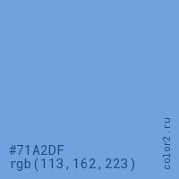 Цвет #71A2DF в цветовой модели RGB обозначается тремя октетами (113, 162, 223) в десятичном формате и #71A2DF в шестнадцатиричном (hex) формате, которые являются интенсивностью красного 113 (hex 71), интенсивность зелёного 162 (hex A2) и интенсивность синего 223 (hex DF).