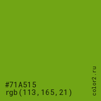 Цвет #71A515 в цветовой модели RGB обозначается тремя октетами (113, 165, 21) в десятичном формате и #71A515 в шестнадцатиричном (hex) формате, которые являются интенсивностью красного 113 (hex 71), интенсивность зелёного 165 (hex A5) и интенсивность синего 21 (hex 15).