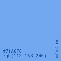 Цвет #71A8F0 в цветовой модели RGB обозначается тремя октетами (113, 168, 240) в десятичном формате и #71A8F0 в шестнадцатиричном (hex) формате, которые являются интенсивностью красного 113 (hex 71), интенсивность зелёного 168 (hex A8) и интенсивность синего 240 (hex F0).
