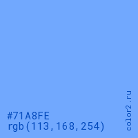 Цвет #71A8FE в цветовой модели RGB обозначается тремя октетами (113, 168, 254) в десятичном формате и #71A8FE в шестнадцатиричном (hex) формате, которые являются интенсивностью красного 113 (hex 71), интенсивность зелёного 168 (hex A8) и интенсивность синего 254 (hex FE).