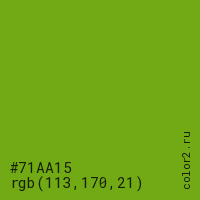 Цвет #71AA15 в цветовой модели RGB обозначается тремя октетами (113, 170, 21) в десятичном формате и #71AA15 в шестнадцатиричном (hex) формате, которые являются интенсивностью красного 113 (hex 71), интенсивность зелёного 170 (hex AA) и интенсивность синего 21 (hex 15).