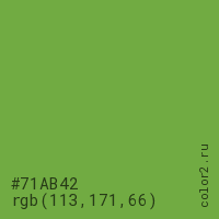 Цвет #71AB42 в цветовой модели RGB обозначается тремя октетами (113, 171, 66) в десятичном формате и #71AB42 в шестнадцатиричном (hex) формате, которые являются интенсивностью красного 113 (hex 71), интенсивность зелёного 171 (hex AB) и интенсивность синего 66 (hex 42).