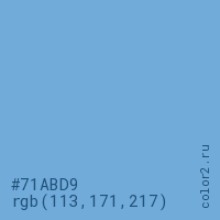 Цвет #71ABD9 в цветовой модели RGB обозначается тремя октетами (113, 171, 217) в десятичном формате и #71ABD9 в шестнадцатиричном (hex) формате, которые являются интенсивностью красного 113 (hex 71), интенсивность зелёного 171 (hex AB) и интенсивность синего 217 (hex D9).