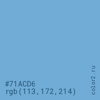 Цвет #71ACD6 в цветовой модели RGB обозначается тремя октетами (113, 172, 214) в десятичном формате и #71ACD6 в шестнадцатиричном (hex) формате, которые являются интенсивностью красного 113 (hex 71), интенсивность зелёного 172 (hex AC) и интенсивность синего 214 (hex D6).
