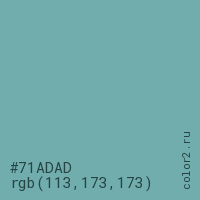 Цвет #71ADAD в цветовой модели RGB обозначается тремя октетами (113, 173, 173) в десятичном формате и #71ADAD в шестнадцатиричном (hex) формате, которые являются интенсивностью красного 113 (hex 71), интенсивность зелёного 173 (hex AD) и интенсивность синего 173 (hex AD).
