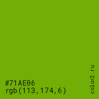 Цвет #71AE06 в цветовой модели RGB обозначается тремя октетами (113, 174, 6) в десятичном формате и #71AE06 в шестнадцатиричном (hex) формате, которые являются интенсивностью красного 113 (hex 71), интенсивность зелёного 174 (hex AE) и интенсивность синего 6 (hex 06).