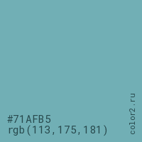 Цвет #71AFB5 в цветовой модели RGB обозначается тремя октетами (113, 175, 181) в десятичном формате и #71AFB5 в шестнадцатиричном (hex) формате, которые являются интенсивностью красного 113 (hex 71), интенсивность зелёного 175 (hex AF) и интенсивность синего 181 (hex B5).