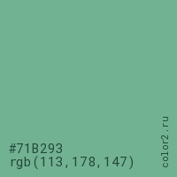 Цвет #71B293 в цветовой модели RGB обозначается тремя октетами (113, 178, 147) в десятичном формате и #71B293 в шестнадцатиричном (hex) формате, которые являются интенсивностью красного 113 (hex 71), интенсивность зелёного 178 (hex B2) и интенсивность синего 147 (hex 93).