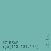 Цвет #71B5AE в цветовой модели RGB обозначается тремя октетами (113, 181, 174) в десятичном формате и #71B5AE в шестнадцатиричном (hex) формате, которые являются интенсивностью красного 113 (hex 71), интенсивность зелёного 181 (hex B5) и интенсивность синего 174 (hex AE).