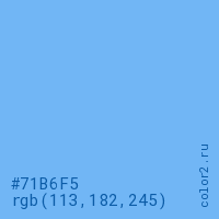 Цвет #71B6F5 в цветовой модели RGB обозначается тремя октетами (113, 182, 245) в десятичном формате и #71B6F5 в шестнадцатиричном (hex) формате, которые являются интенсивностью красного 113 (hex 71), интенсивность зелёного 182 (hex B6) и интенсивность синего 245 (hex F5).