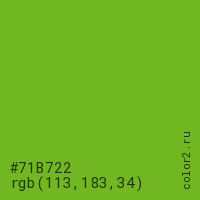 Цвет #71B722 в цветовой модели RGB обозначается тремя октетами (113, 183, 34) в десятичном формате и #71B722 в шестнадцатиричном (hex) формате, которые являются интенсивностью красного 113 (hex 71), интенсивность зелёного 183 (hex B7) и интенсивность синего 34 (hex 22).