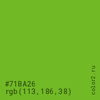 Цвет #71BA26 в цветовой модели RGB обозначается тремя октетами (113, 186, 38) в десятичном формате и #71BA26 в шестнадцатиричном (hex) формате, которые являются интенсивностью красного 113 (hex 71), интенсивность зелёного 186 (hex BA) и интенсивность синего 38 (hex 26).