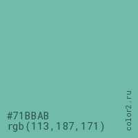 Цвет #71BBAB в цветовой модели RGB обозначается тремя октетами (113, 187, 171) в десятичном формате и #71BBAB в шестнадцатиричном (hex) формате, которые являются интенсивностью красного 113 (hex 71), интенсивность зелёного 187 (hex BB) и интенсивность синего 171 (hex AB).