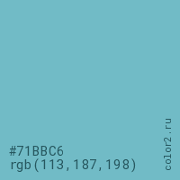Цвет #71BBC6 в цветовой модели RGB обозначается тремя октетами (113, 187, 198) в десятичном формате и #71BBC6 в шестнадцатиричном (hex) формате, которые являются интенсивностью красного 113 (hex 71), интенсивность зелёного 187 (hex BB) и интенсивность синего 198 (hex C6).